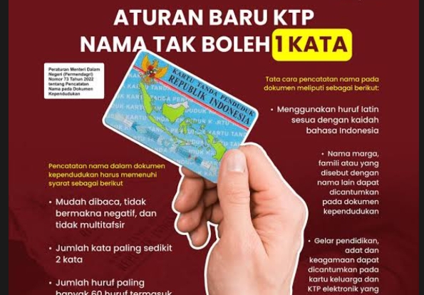 Dalam aturan Ayat 2 Pasal 4 Permendagri tersebut menjelaskan bahwa sekarang nama seseorang tidak boleh hanya terdiri dari satu kata.